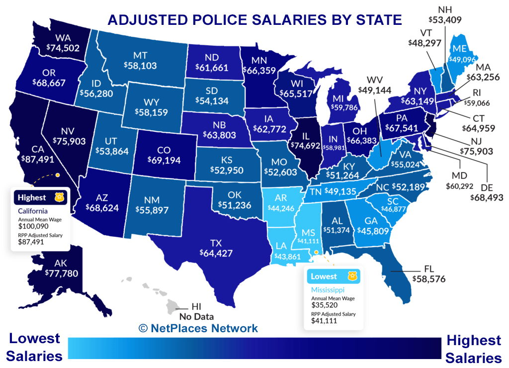 Officers receive generous salaries, paid vacations, medical insurance, workman’s comp and generous retirement benefits (click map above for salaries). There are no “benefits” for police horses. When too old to work most horses become zoo or pet food… Thankfully, police dogs are usually retired to the officer’s family or friends.